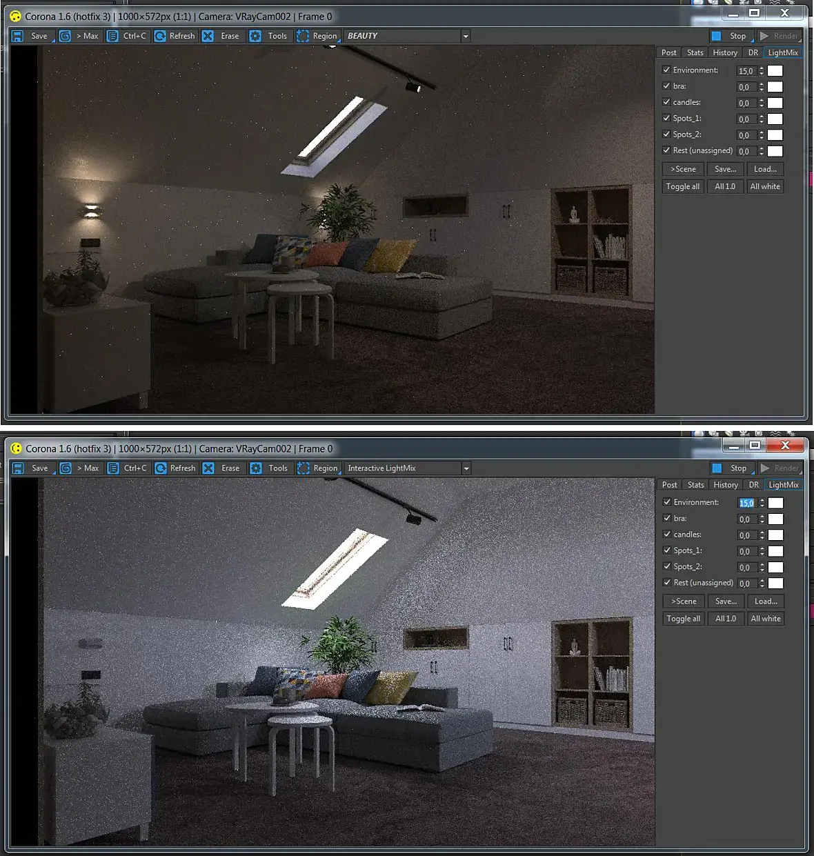 Кто-нибудь встречался с такой же проблемой? Элемент Beauty совершенно не реагирует на изменения света. На скринах светит только environment, Lightmix отображает правильно, но стоит перейти во вкладку Beauty - загораются другие источники света.