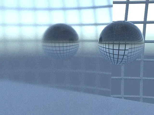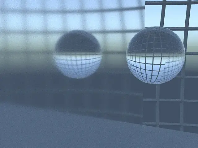 например зеркало с glossiness = 0.99 и ниже, и шар с преломлением (для наглядности без отражений), в результате отражения шарика в зеркале не будет.