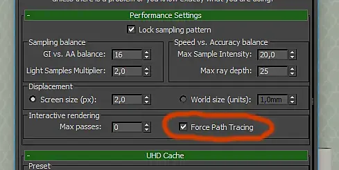 Итого. Чтобы не юзать path tracing и получить ускорение отклика надо не эту галку включать, а в настройках uhd кеша в precision поставить 0,01 . Тогда просчет вторички будет занимать гораздо меньшее время.