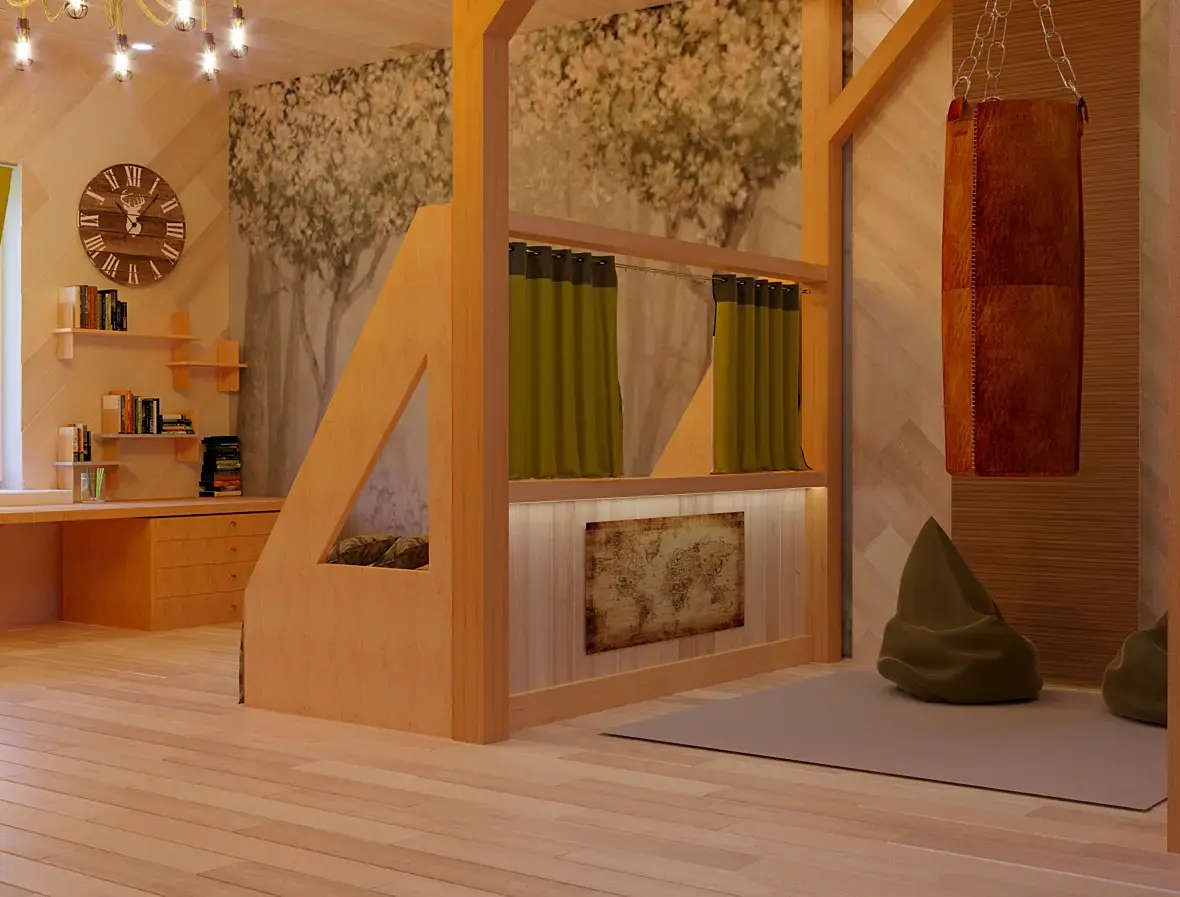 Так -же непонятна холобуда возле кровати?Думаю что м наклон дерева на стенах тоже Не для чего.