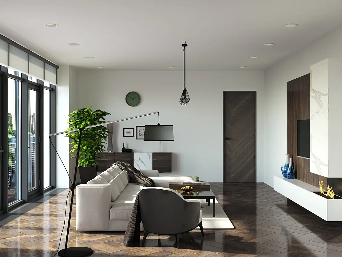 хм, пол шибко лакирован, так-же возможно, надо добавить плинтус "скрытого монтажа", потолок оторвать от стен, теневым швом, освещение, вместо точечных на технический свет в виде линий, а свисающий светильник или вообще убрать или, если он необходим всё-же для акцента, заменить на более объемный, тоже из проволоки,,,роликовые шторы хорошо, но для комфорта, если это жилой интерьер, добавить вертикальные портьеры с нишей под карниз,,,шпон за телеком дотянуть вверх,,,на дальней стене вместо небольших картинок и часов сделать панно из объемных панелей,,,наверно так,,,