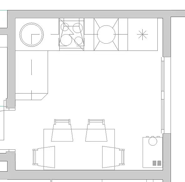 А я бы не делала угловую кухню на такой площади. Не стоит того, мало дополнительной рабочей поверхности и дурацкий угловой шкаф, где всё оставленное по закону физики канет в небытие. Плюс раковина в углу - это такое себе. Раз делаете круглую, кстати, то пусть она будет хотя бы достаточно глубокой. А лучше - нормальной, прямоугольной.