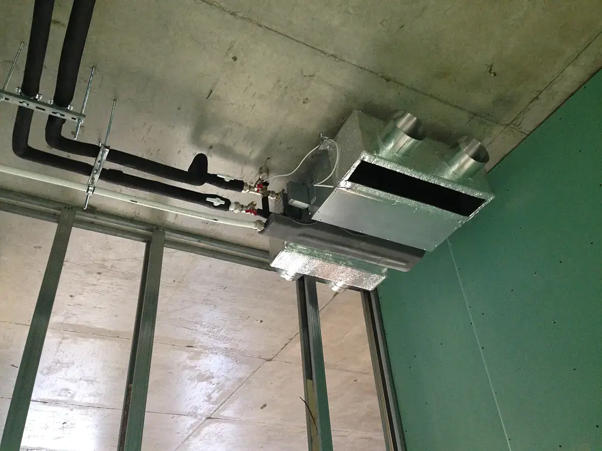 У меня недавно была квартира 50м2. Блок был в квартире в прихожей, там мы потолок опустили на 30 см. А в две комнаты две гофры от него по 10 см. Длина гофр была примерно 2м и около 10м. Изначально от строителя гофры были примерно по 20 см. Но мы связывались с компанией, которая ставила там систему вентиляции и нам разрешили сделать по 10 см.