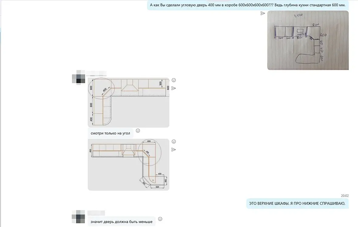 Она хотела угол под 45 с размерами 600х600 как на рисунке от руки (это она рисовала), что при всём желании не получиться. Даже кухню глубиной меньше не сделать, так как там варочная поверхность, духовка, мойка и микроволновка встроенная. Она пыталась доказать что на кубе с равными сторонами по 600мм можно сделать скошенный угол под 45 градусов и размером 400мм.
