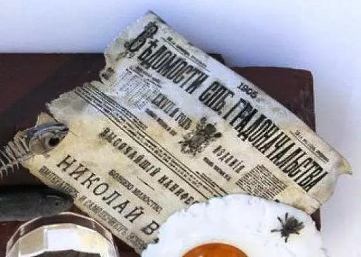 Стакан с водкой — из хрусталя, Кирпич — из яшмы, Желток — из янтаря (иногда Карлу приходилось бить яйца), Рыба серебряная, Окурок — из серебра и кварца. Белок яйца покрыт эмалью. Из серебра — муха и обрывок газеты. Это "Ведомости Санкт-Петербургского градоначальства" от 18 октября 1905 года с текстом манифеста "Об усовершенствовании государственного порядка", подписанного императором Николаем II.