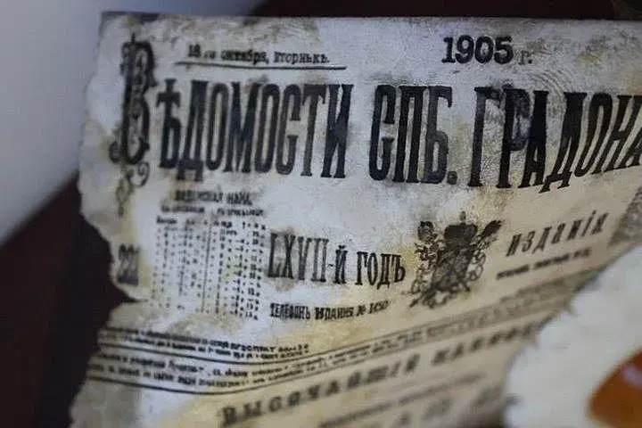 Стакан с водкой — из хрусталя, Кирпич — из яшмы, Желток — из янтаря (иногда Карлу приходилось бить яйца), Рыба серебряная, Окурок — из серебра и кварца. Белок яйца покрыт эмалью. Из серебра — муха и обрывок газеты. Это "Ведомости Санкт-Петербургского градоначальства" от 18 октября 1905 года с текстом манифеста "Об усовершенствовании государственного порядка", подписанного императором Николаем II.