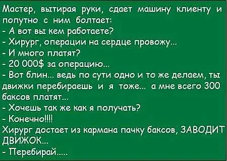 -Ну вот видите, доктор все понимает. А что у нас с шеей? Давно так ходим как куричка набок головочку? И ножки в другую сторону гнутся. И пучит, да? Это психосоматика, это доктор умеет чинить. Смотрите мне в глазки ии повторяйте:"Пошло оно все в...".