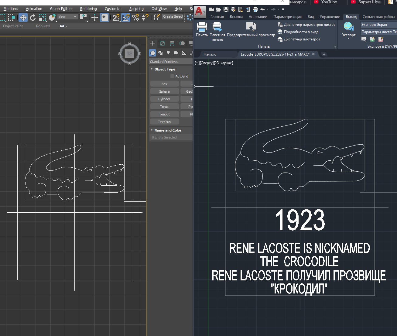 Импорт dwg в corel, из corel экспорт в формате illustrator 8 версии, затем импорт в 3d max