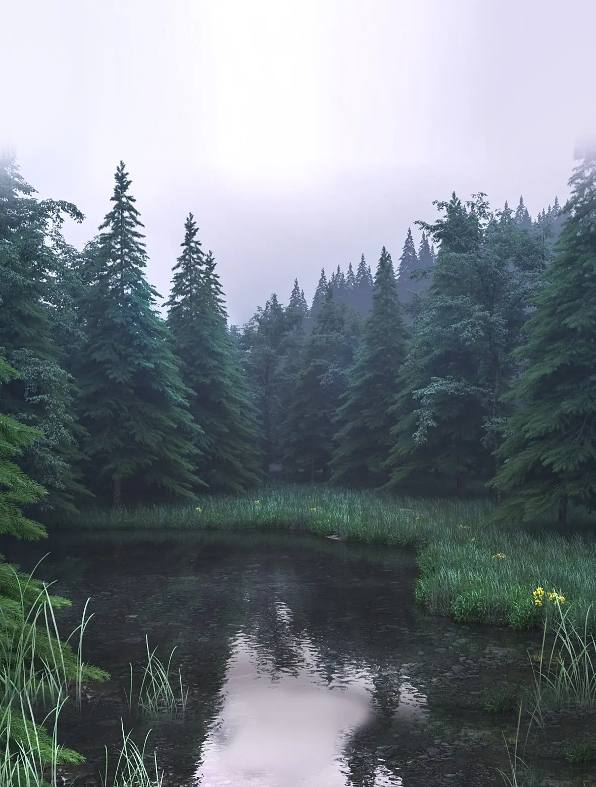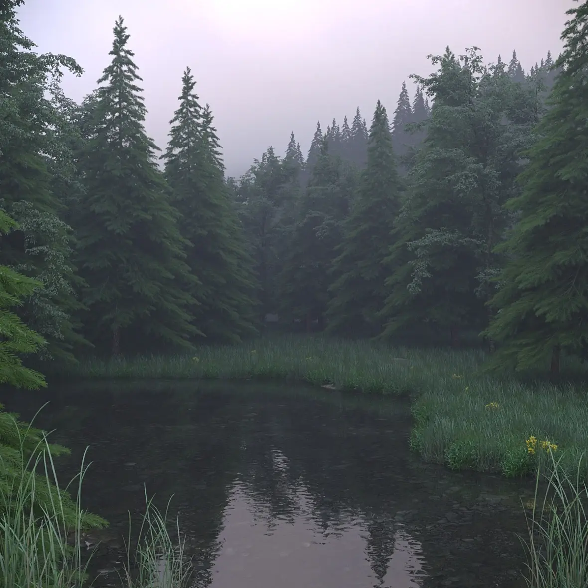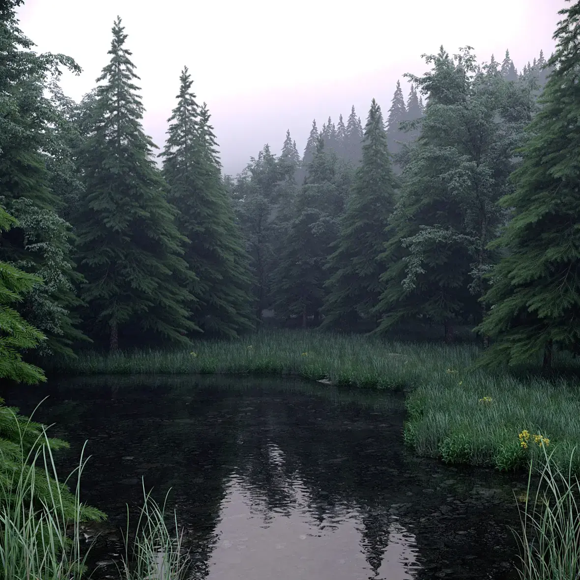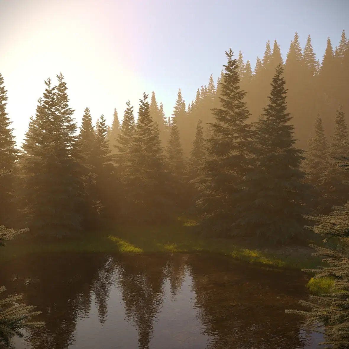 не совсем понятно время картинки, солнце на верху как в полдень а в лесу туман как рано утром. если пасмурно то небо другое должно быть.трава слишком однообразная, не нравится как в воду переходит, и цвет травы слишком в синеву уходит(хотя это в посте можно пофиксить).елки нужно разнообразить, по верхушкам видно что они все одинаквые модельки, даже некоторые не крутятся