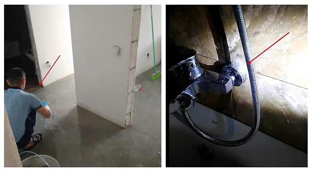 Видите строителя? Он черпает воду совочком в тазик, а там подальше виднеется порожек в ванную. Он вышел пообедать и прорвало соединение, вернулся через час - кругом море по щиколотку. А прорвало соединение на втором скриншоте, и вода лилась по краю ванны на пол. Просто выдавило прокладку. Этого потопа бы не произошло, будь там запрещённый нашими нормами душ с трапом. Конечно, он мог бы перекрыть кран, уходя, но это был бы слишком крутой ход для него. Всё ж по нормам, всё и так нормально. Зачем перекрывать? Порожек справится )))