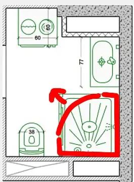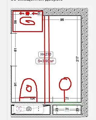 Прошу помощи специалистов с эргономикой ванной. Необходимо поставить душевую (минимальные размеры для удобства 90*90), раковину, унитаз, пенал со стиральной и сушильной машиной, систему хранения (если будет вмещаться) Вариант, который получается приложен в фото (входная дверь на нем смещена вправо). Думаю, что неверно считаю расположение в углах, из за этого получается, что либо унитаз, либо раковина стоит на входе, тк стена с левой стороны от двери по проекту 380 мм Как будет верно?