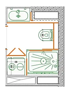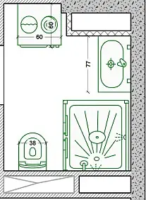 Все эти ванны, кабины, джакузи - это всё давно пора отправить в прошлое. Ну и эт всё сработает, если канашка внизу на плане где-то в коробе. Считаем, что она там, если верить предыдущим планам.
