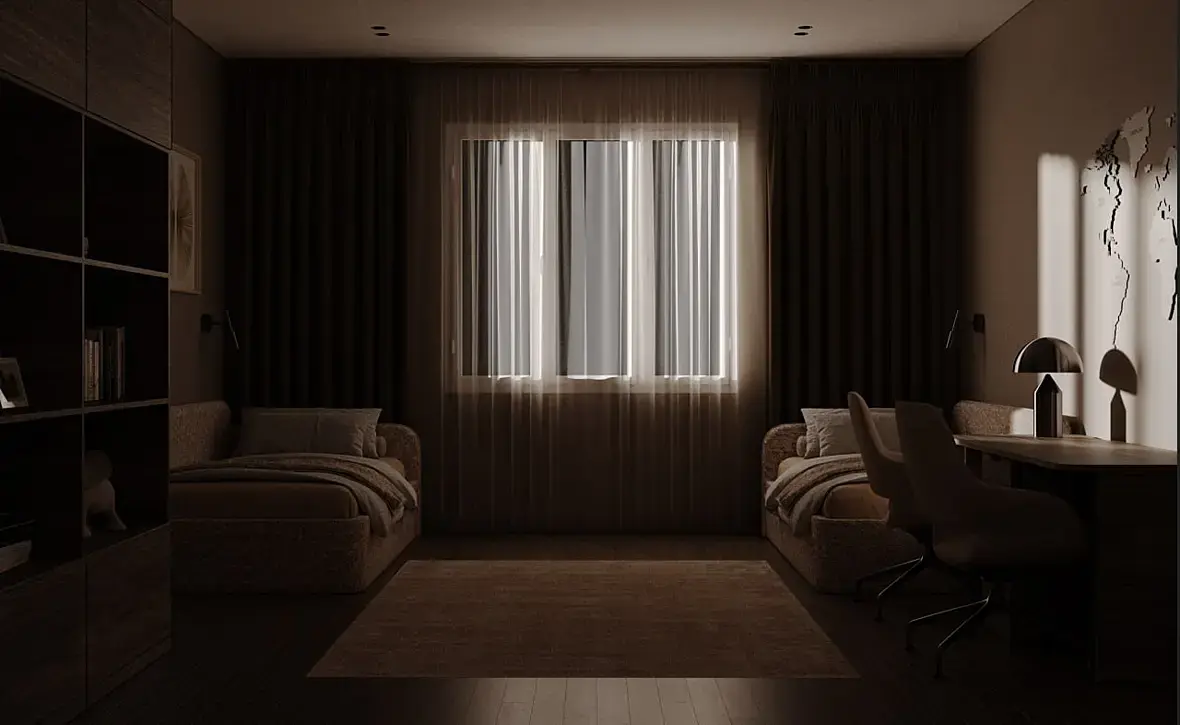 AlenaDantsevich, ну на картинках видно что источник света выключен, есть в короне баг когда фоновая картинка в окне(самосветящаяся или лайт шейдер, возможно даже источник света) отражается черным пятном в блике на стенах, корона вообще не любит фейковые схемы, лучше всего светить солнцем с небом или только небом-для пасмруного настроения, там можно и облака включить. у вас текстуры дерева низкого разрешения, видно размытие, в библиотеки короны или космоса есть нормальное дерево и мапинг дереву обычно надо направлять вдоль длины доски, а не поперек короткой стороны