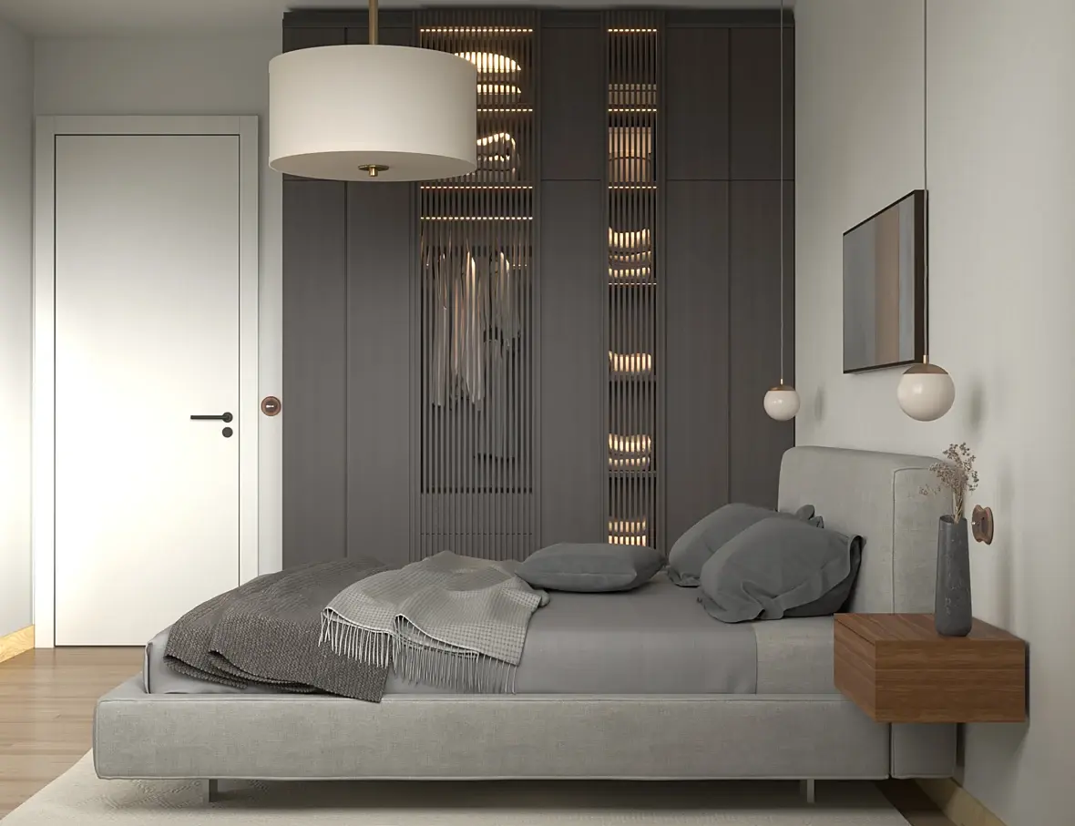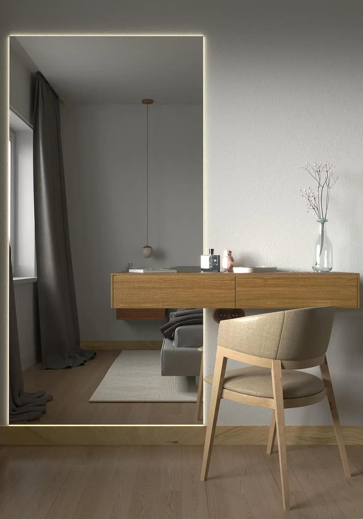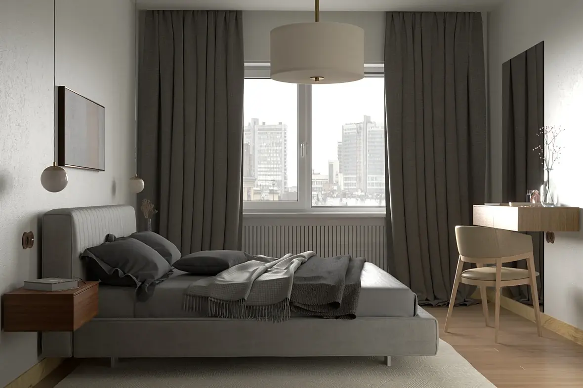 если вкратце и не смотреть на дизайн, свет и материалы надо править, особенно материалы, у вас ткань на стуле блестит как пластик, к постельному белью тоже вопросы текстура на плинтусе растянута, на дереве на последнем ракурсе бамп слишком сильный, свет от солнца дает очень сильный пережжённый блик но при этом в целом не хватает контраста и все достаточно блеклое, люстра не в масштабе