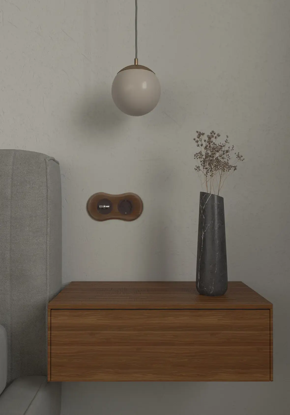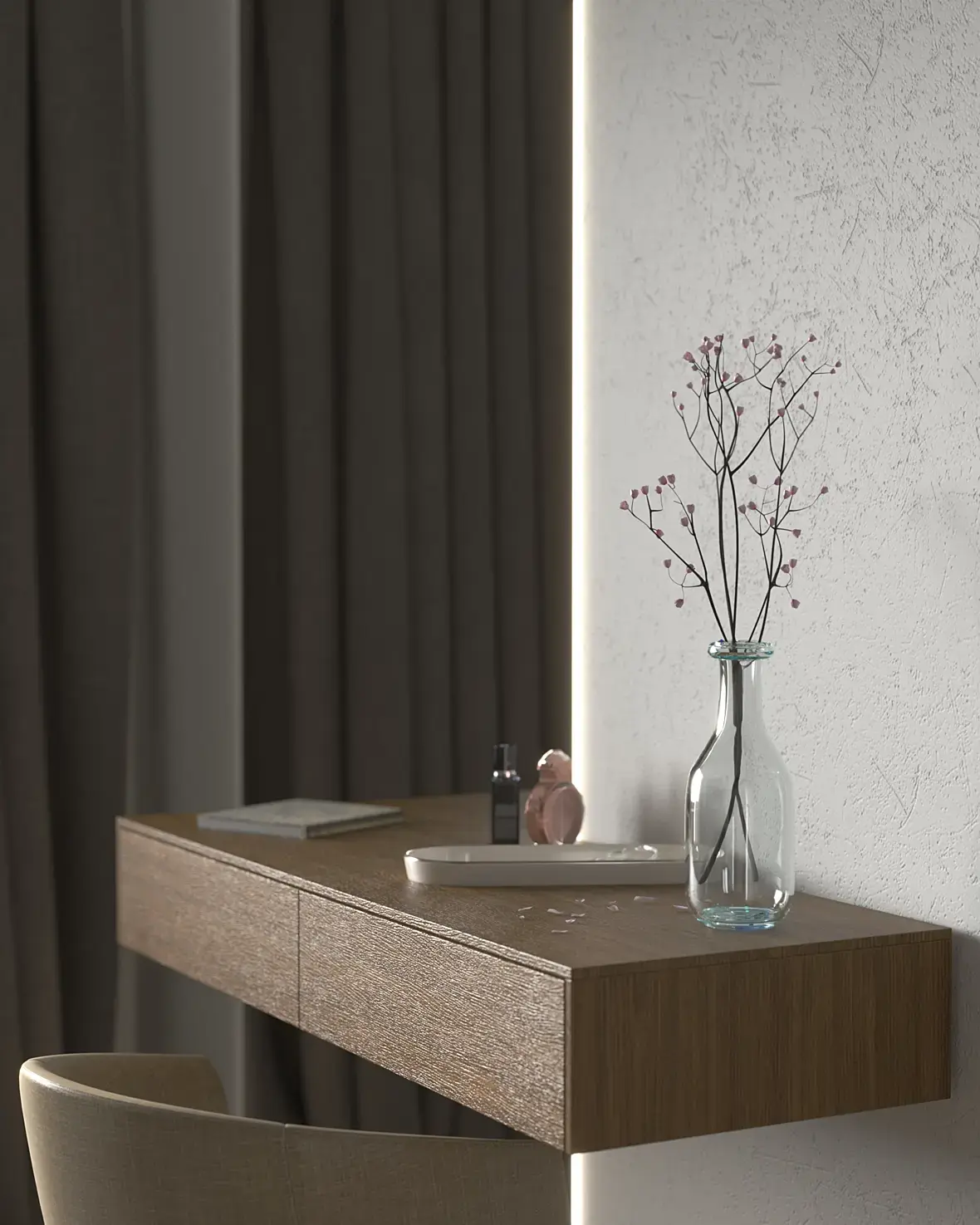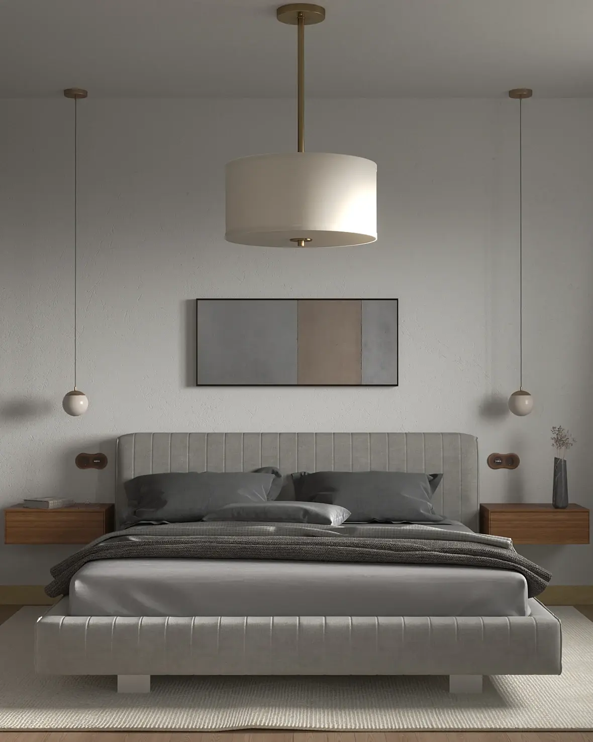 если вкратце и не смотреть на дизайн, свет и материалы надо править, особенно материалы, у вас ткань на стуле блестит как пластик, к постельному белью тоже вопросы текстура на плинтусе растянута, на дереве на последнем ракурсе бамп слишком сильный, свет от солнца дает очень сильный пережжённый блик но при этом в целом не хватает контраста и все достаточно блеклое, люстра не в масштабе