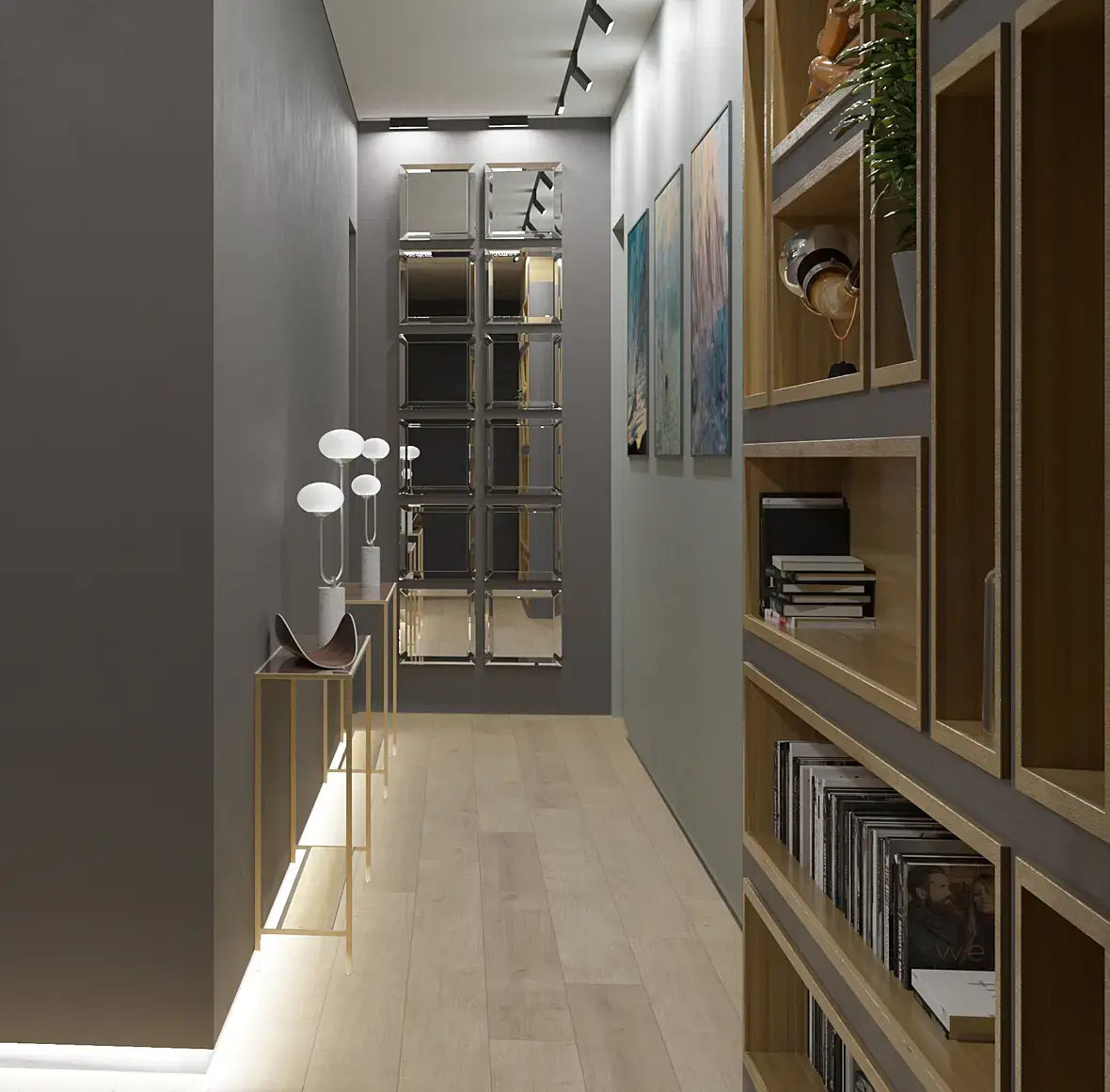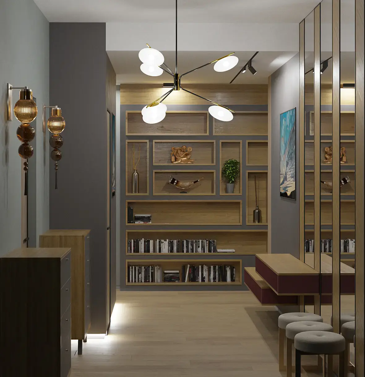 Начну с дизайна: он странноватенький. Выше есть коммент по поводу подсветки снизу - она действительно избыточна и не вяжется с общей общей обстановкой. Большое нагромождение полок и тумб, много стульев (кто там будет сидеть, в коридоре этом?). Декор расставлен нелогично - вазы (бессмысленные и случайные, словно просто чтобы были) стоят в доступности, а за книжками нужно корячиться в самый низ. В светильниках - полный винегрет. Цветовое решение тяжелое - насыщенное дерево, марсала и сине-серый... Дополнительные яркие цвета на картинах еще больше атмосферу сгущают.