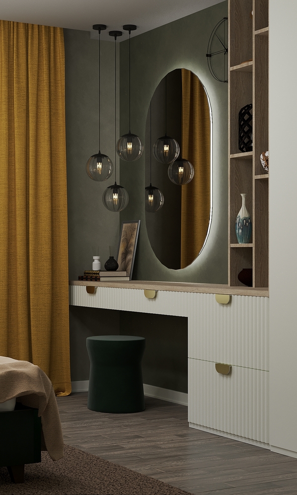 Никакого ответа не последовало)Если всё еще актуально - Скучноватый свет, тайлинг текстуры на столешнице, ковер смотрится не реалистично как и покрывало, оно больше похоже на картон или клеёнку. Надо работать с материалами и светом.