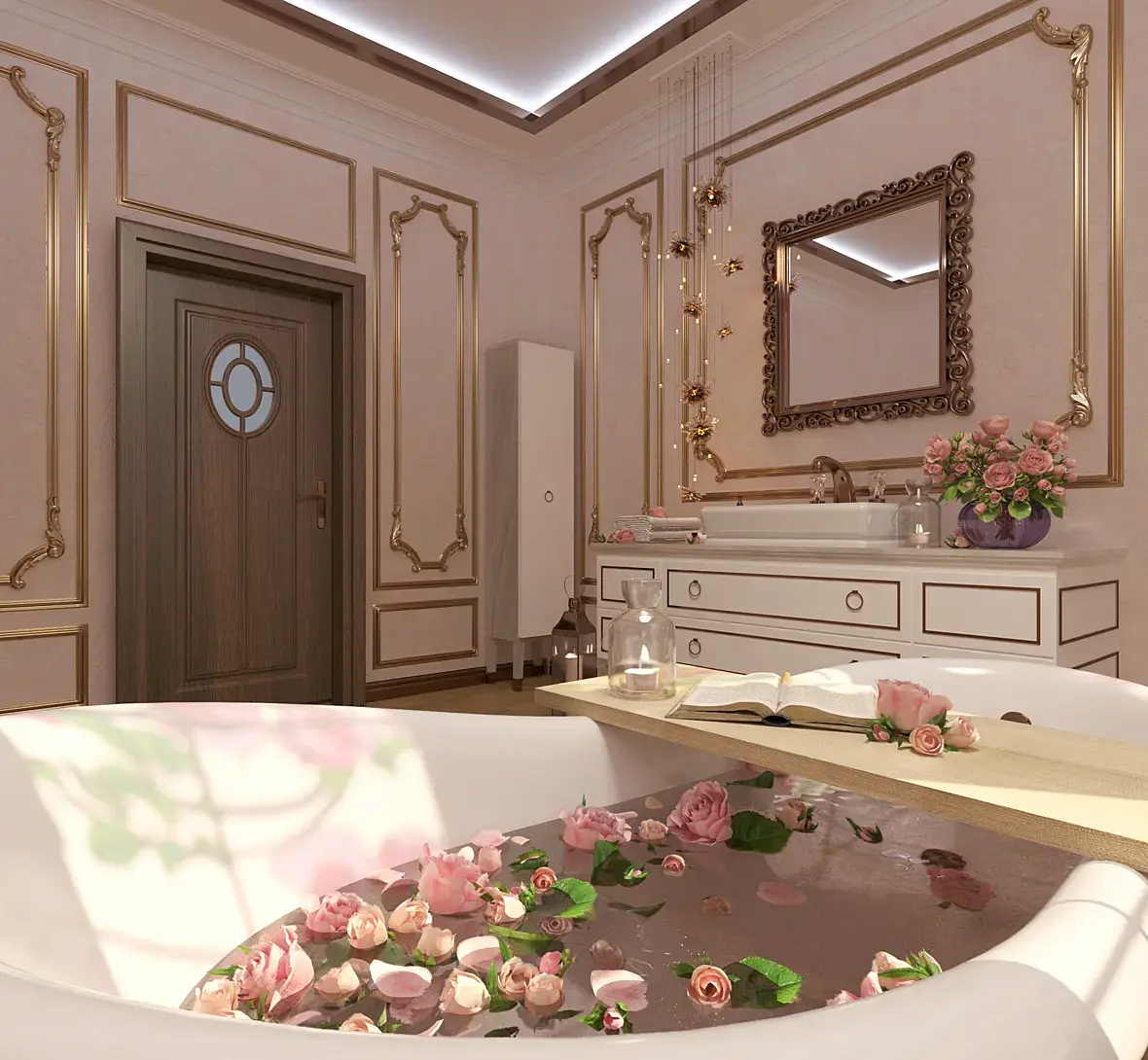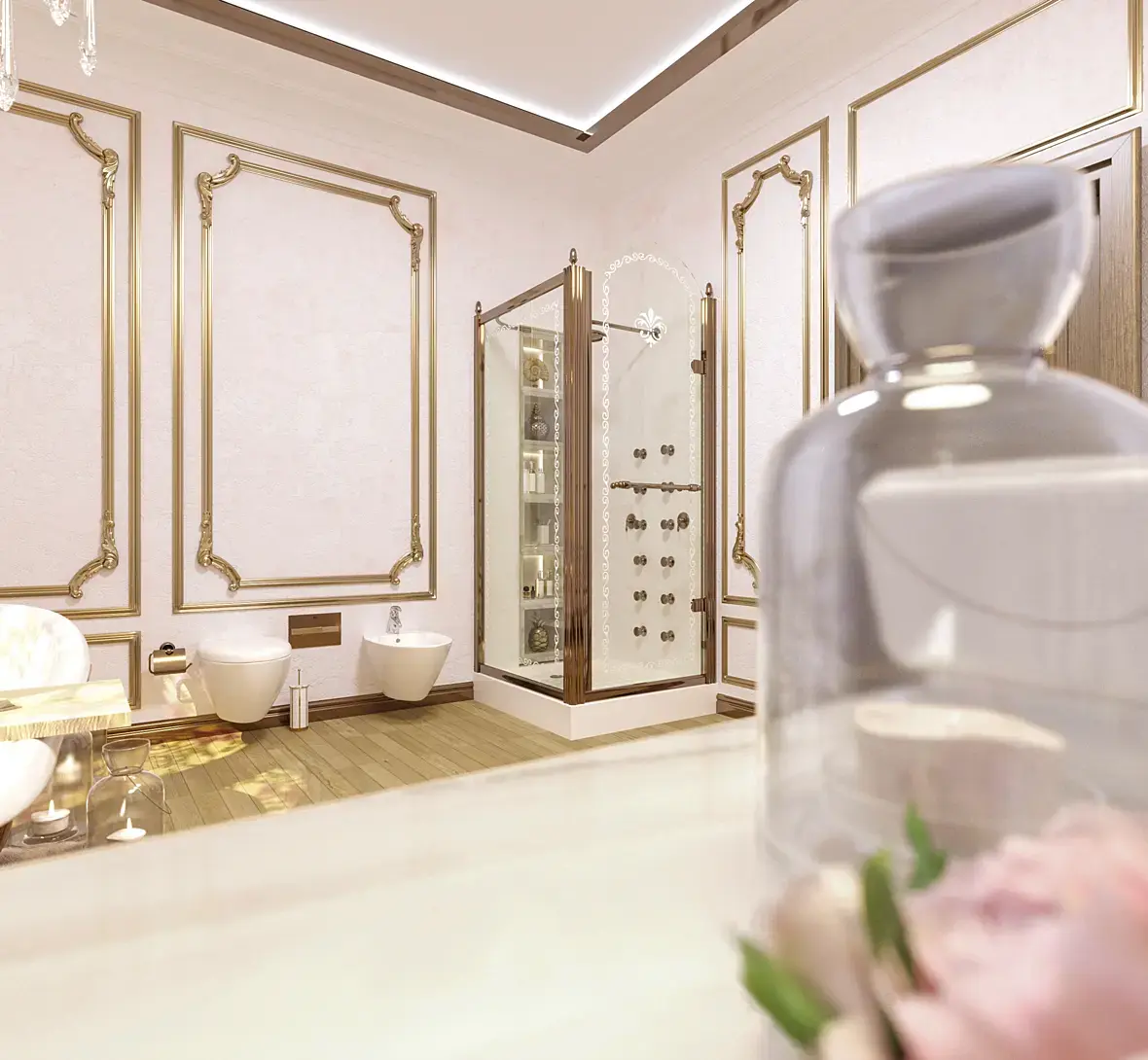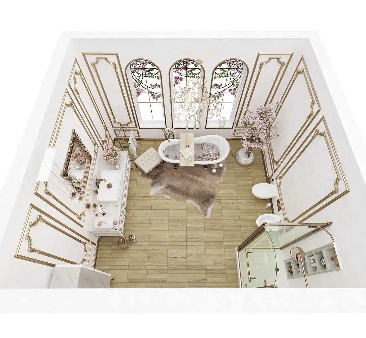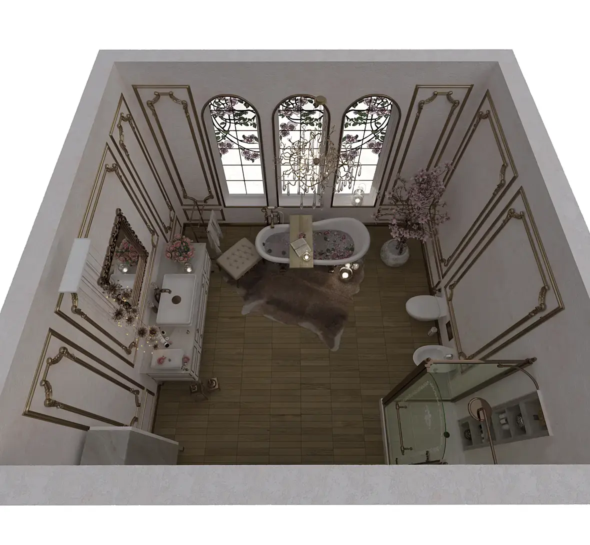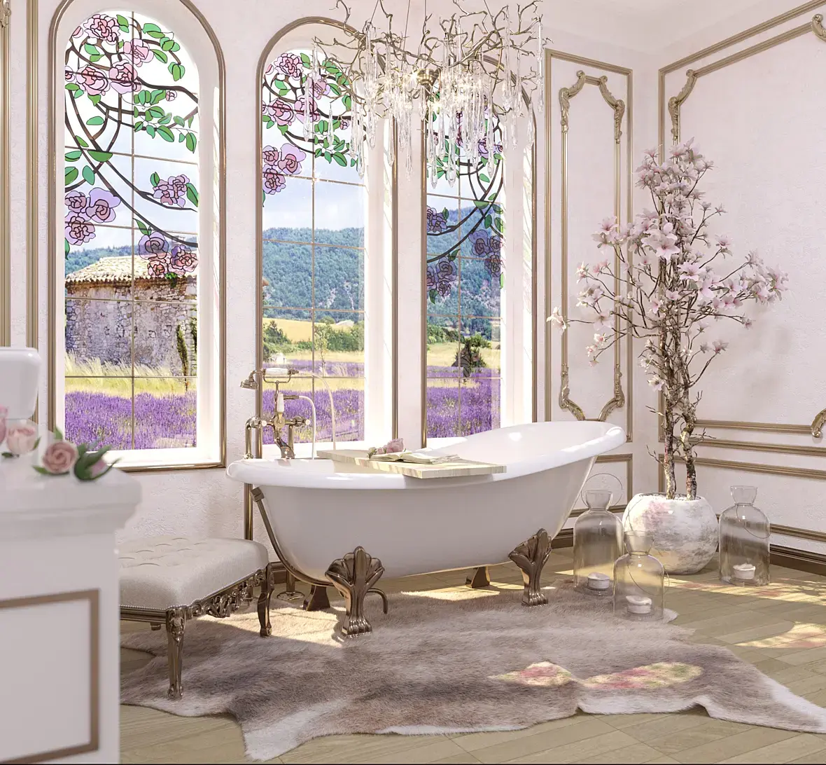 Да ладно. Дизайн имеет право на жизнь, намёк на любовь к золоту тут скорее, не в сторону востока, а в сторону ар деко и китча. Поменять витраж, убрать "пересветы", вообще сделать свет более локальным, например оставить свет от люстры над ванной и подсветку зеркала, подтянуть рендер, убрать широкий угол у камеры.