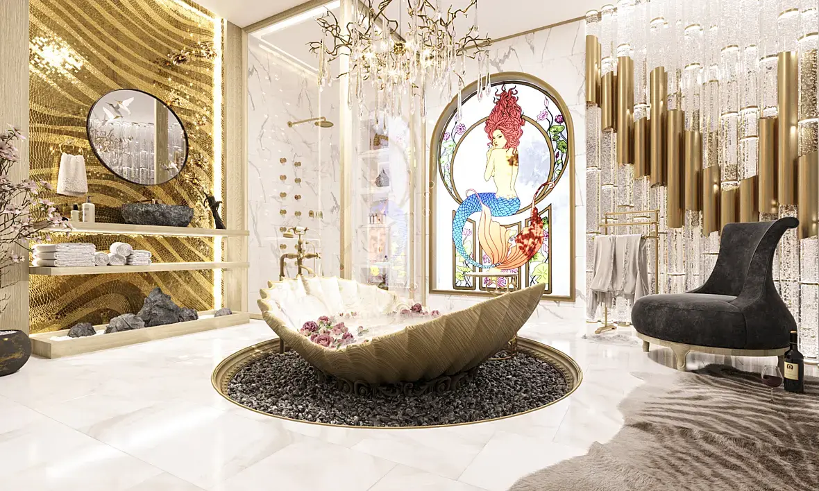 не хватает некоторой роскоши что ли... полноценной. есчли уж стемление к ней. какие то камни непонятные как с улицы валяются, галька... если бы они с блёстками были на сколах что ли... или огранённые под хрусталь. шкура под креслом не роскошная. потертая с вышорканным мехом (если он вообще есть). Витраж, согласен на 100%, вообще не от сюда. мультяшный. есть крутые с золотом серьезные витражи. даже и с русалками. Русалку если это центральный персонаж вообще лучше сделать СТАТУЕЙ! а не нашлепкой на стену (но тогда она будет перетягивать на себя всё внимание. ну тогда барельефом) . Раковина - ведь реальная. люстра - вообще непонятно что такое. трубы - слишком крупные. грубые. Душевая - лучше использовать мозаику, может вставками вертикальными такми чем такой "мрамор" как общественный пол. в общем надо всё допиливать. определиться что главное (какая тема), где акцент, ну как то так.