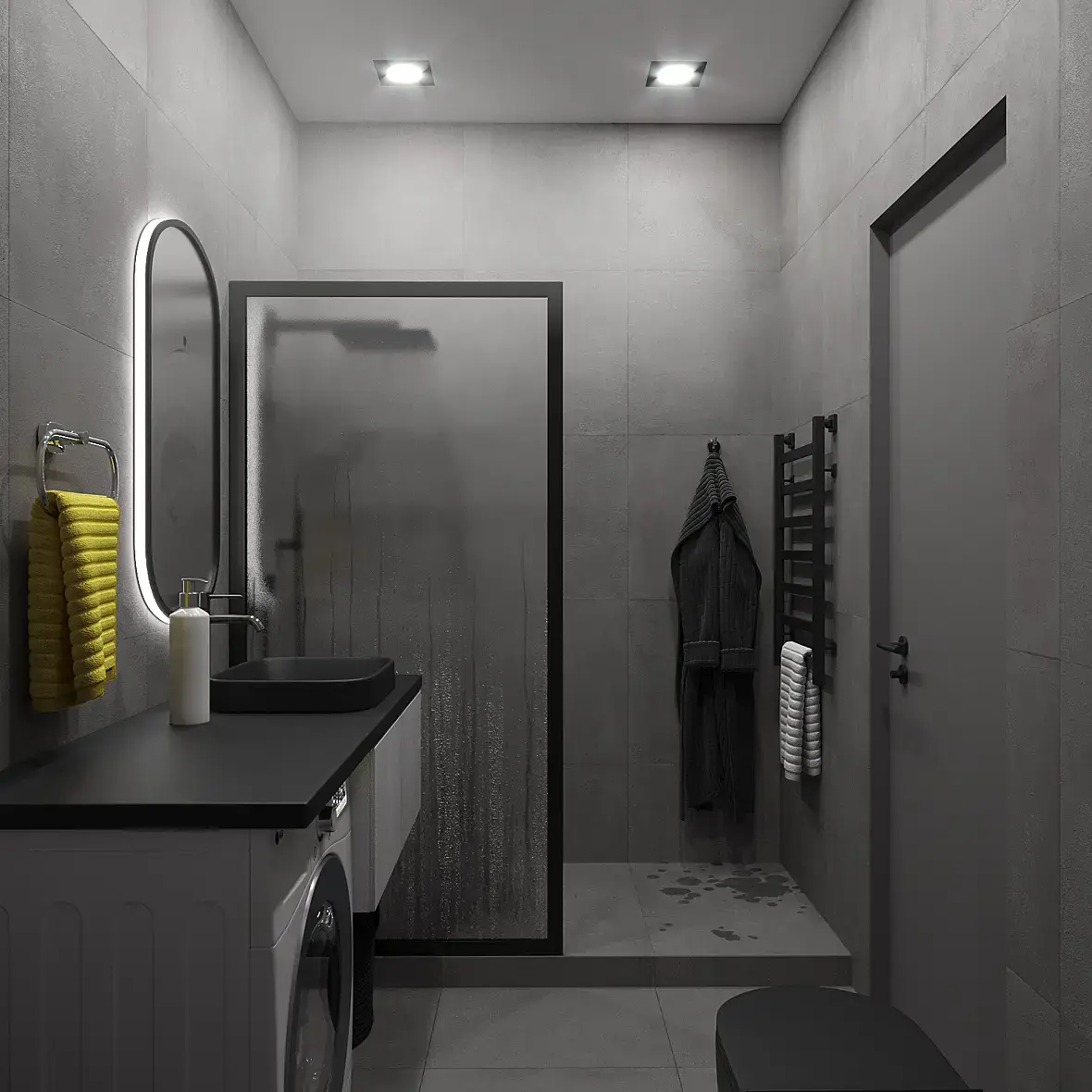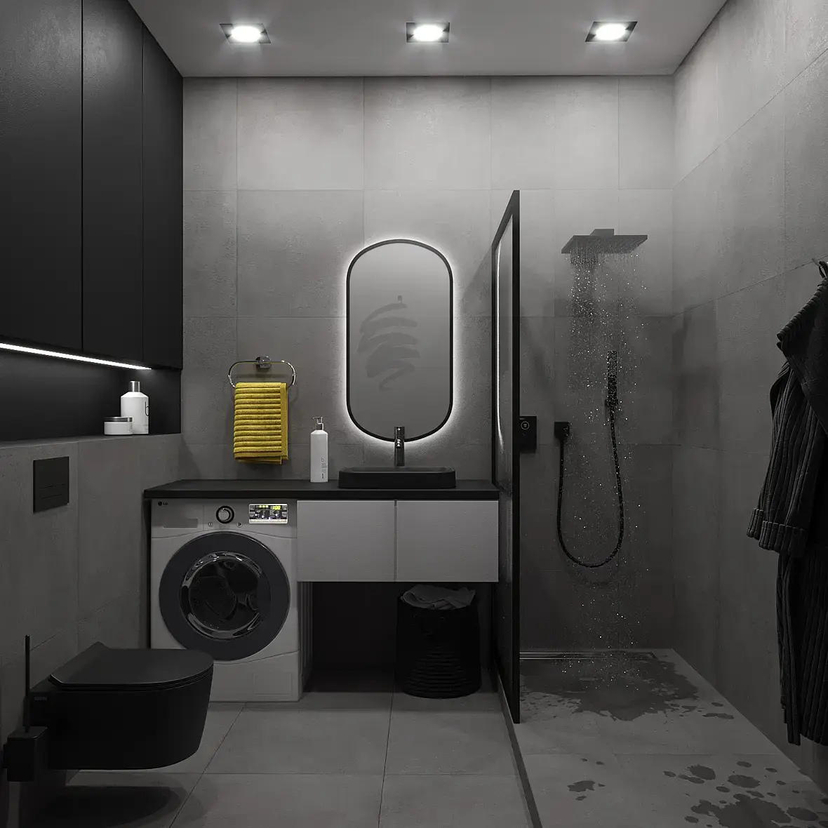 на рендерах с водой темновато, тени все в черноту ушли, вода под душем неестественная - как будто уронили банку, здесь разольется более равномерно. Плюс сам материал воды на полу не очень. Душевую лейку хочется поднять повыше
