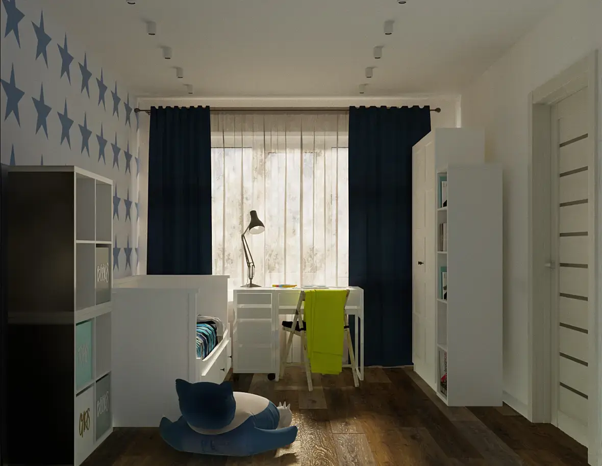 Без солнца рендер будет слишком невзрачным,солнце можно сделать большим,допустим размер 10 и интенсивность до 0,2.Ну и поставить импут цвет еле-еле желтым,тогда рендер будет и не однообразным и при этом комната равномерно будет залита светом.