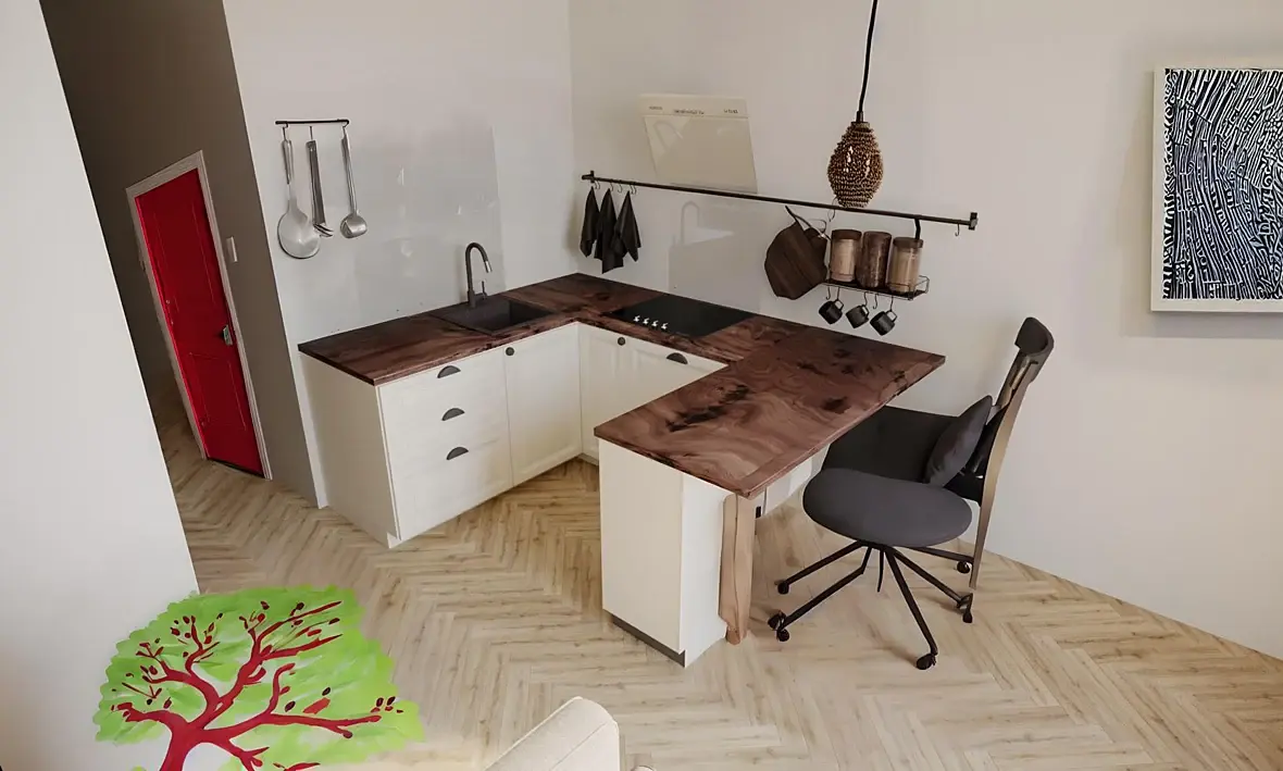 Текстура столешницы странная. Уж если слеб дерева- то цельный и потолще, а не клееный из кусков. Кроме того, столешница должна хотя бы на 25-30 мм нависать над фасадами (чтоб грязь не текла на фасад)