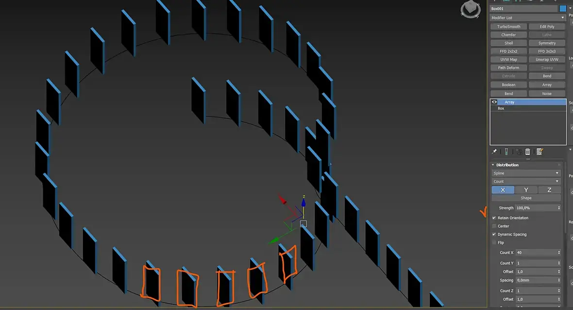 Привет, суть вопроса такая, есть сплайн, он не равномерный и имеет разные радиусы и положение точек. На нем нужно разместить боксы которые б наследовали направление но не поворачивались по оси x и y.  Через spacing tools имеем такую картинку, и нужно как показано оранжевым. То есть наследовался поворот по оси z. Текже через новый эрей не получается, оно смотрит вверх как нужно но не наследует поворот. Может кто знает как решить этот вопрос, заранее спасибо.
