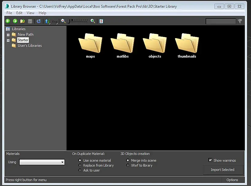 A: Open "Library Browser" -> File -> Preferences -> select "User's Libraries" -> Modify -> %LocalAppData%\Itoo Software\Forest Pack Pro\lib -> Use Path -> OK