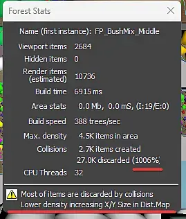 Take care when using Collision Detection: if you increase the density of trees (using a dense map or lowering the X/Y parameters), you may get the same number of trees, because most of them are discarded by collisions, but the plugin will have an extra workload in order to process them. This condition is alerted in the Forest Stats window, when the number of discarded trees is greater than 50%.