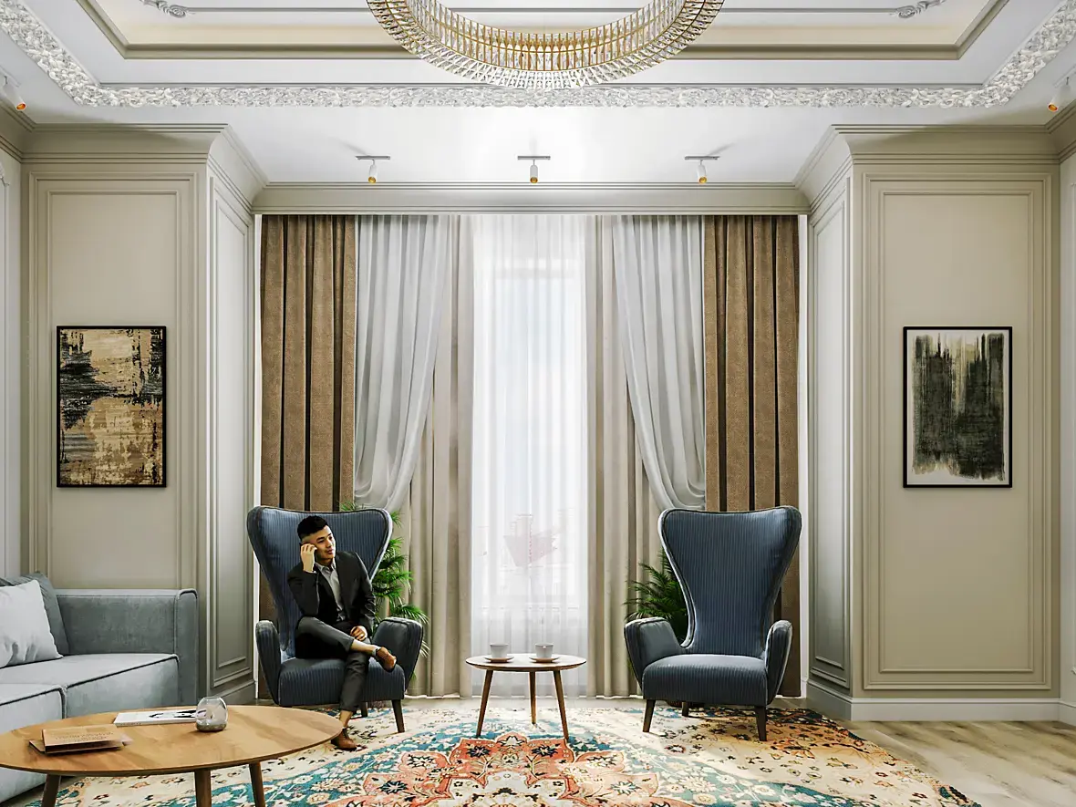 если по визу, то текстура ковра обрезана, пол странный , текстура штор крупновата, несоразмерность человека и кофейных чашек, по композиции у вас левая сторона перегружена, я бы пересадила человека и убрала картину, страницы книг украли