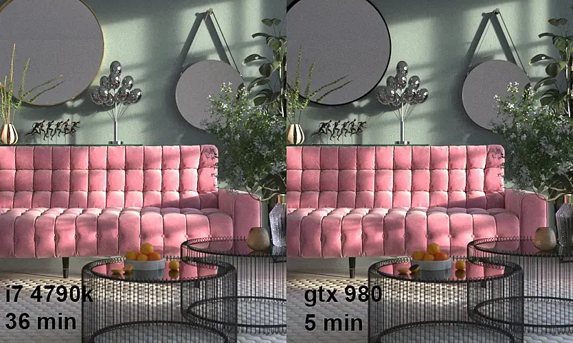 Кстати, я недавно сравнивал вирей гпу против вирей цпу. Разрешение маленькое, для себя чисто. Был конечно поражен. Рендер был до предела шума 0,01. Брутфорс везде. Результаты -