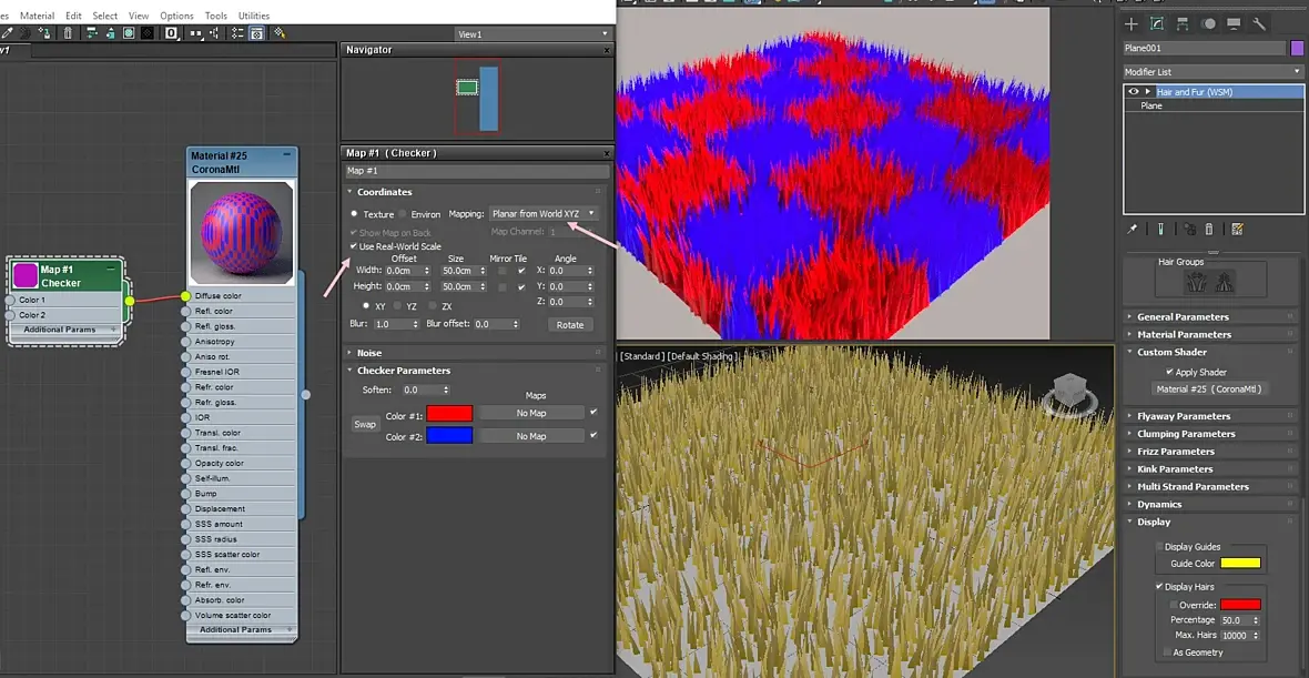 в схожей теме, ну я сказал самое простое это ворлд скейл текстуре включить и вставить в слот материала волос,на форуме короны мару дикий метод предлагает, вставлять текстуру в цвет корней и кончиков, но тогда не будет регулировки отражений и тд. Либо предлагает орнатрикс использовать)