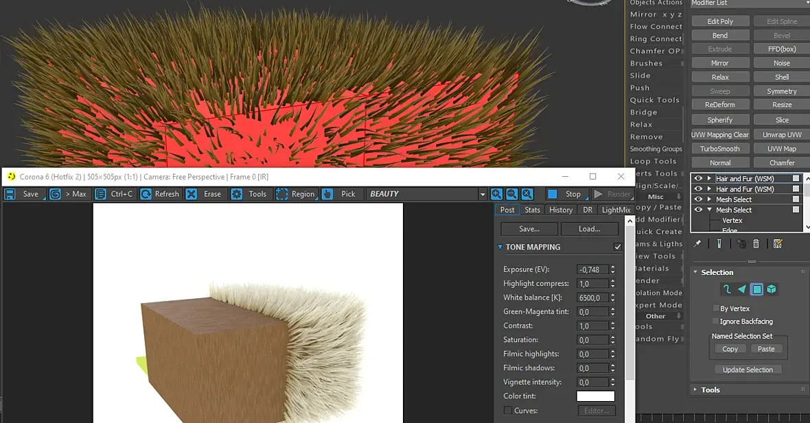 При двойном применении Hair&Fur и Mesh Select (3ds max 2020, Corona 6) в окне перспективы видны оба участка с шерстью, а на рендере и в интерактивном окне нижний слой (в стеке) виден только при отключении верхнего. Переключение в Environment and Effects/Effects не помогают. Проблемы с объектом исключены, т.к. подобное даже на боксе. Все пути на латинице. Подскажите, пожалуйста, в чем может быть проблема.