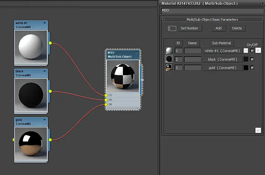 Когда я говорю про "независимость материала" я имею ввиду отсутствие Parent, как мы видим в случае с MultiSub Object. Все материалы внутри этого будут зависимы от их родителя, в то время как BitMap или CoronaBitMap - это независимые материалы.