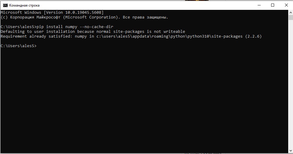 5. Очистка кэша pip Иногда помогает очистка кэша pip:pip cache purge pip install numpy
