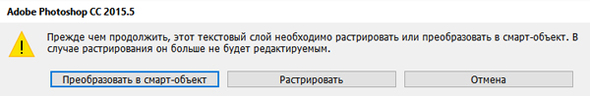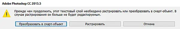 Попробуем применить к текстовому слою любой из фильтров – у Вас всплывёт такое вот окно: