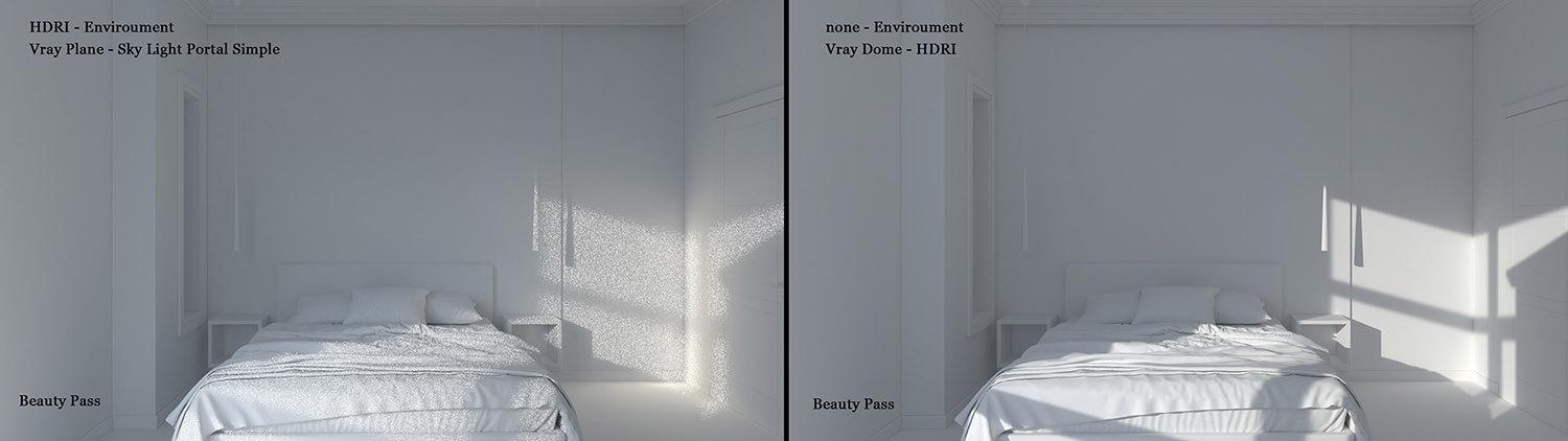 Ну вы бы тесты провели сначала. Всё так - VRayLight в режиме Simple Light Portal намного шумнее, чем VRayDomeLight с тем же HDRI (с отключенным Adaptive Light).