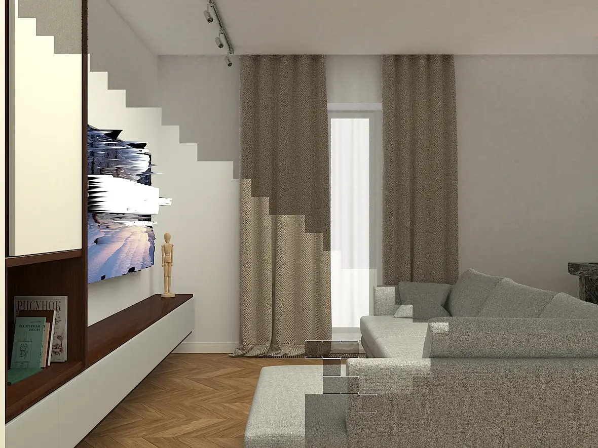 При рендере с ракурсов не фронтальных происходит такое искажение. В другой сцене этот телик работал норм , но картинку ставила не родню (эта родная- хотелось бы оставить)