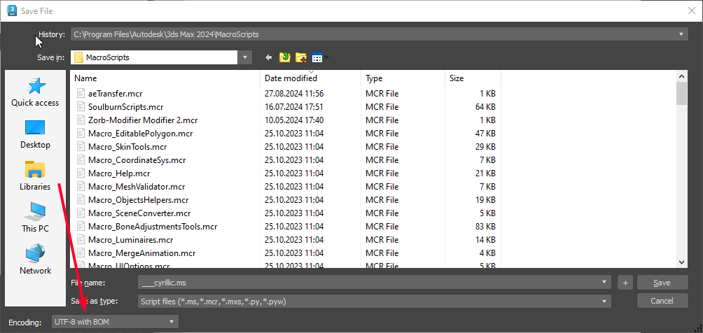 Написал скрипт, но писал все на русском, при первом запуске 3dmax отображает нормально, но после того как открываю заново макс то за место русских букв просто знаки вопроса "??????".