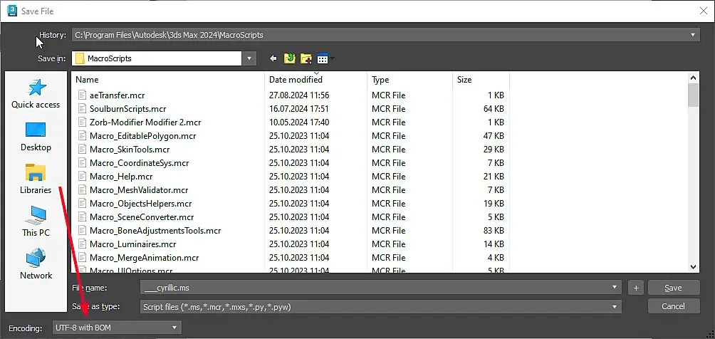 Приветствую, подскажите пожалуйста кто может. Написал скрипт, но писал все на русском, при первом запуске 3dmax отображает нормально, но после того как открываю заново макс то за место русских букв просто знаки вопроса "??????". Кто-то сталкивался с таким, можете помочь?