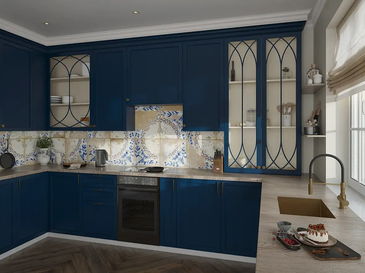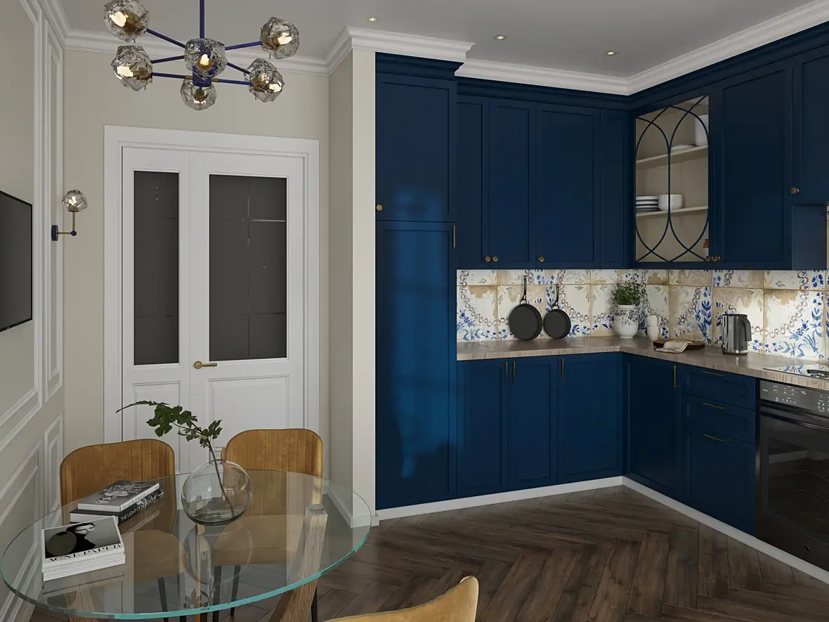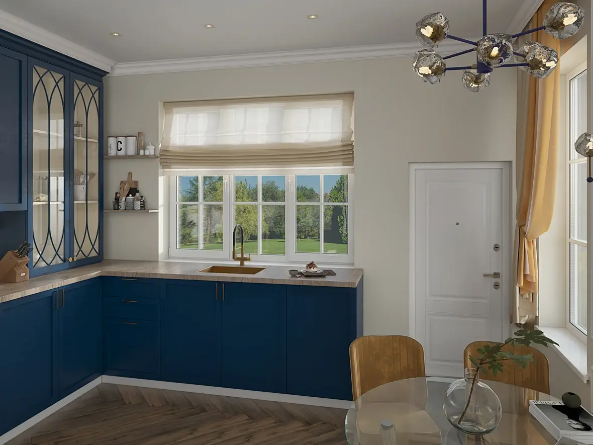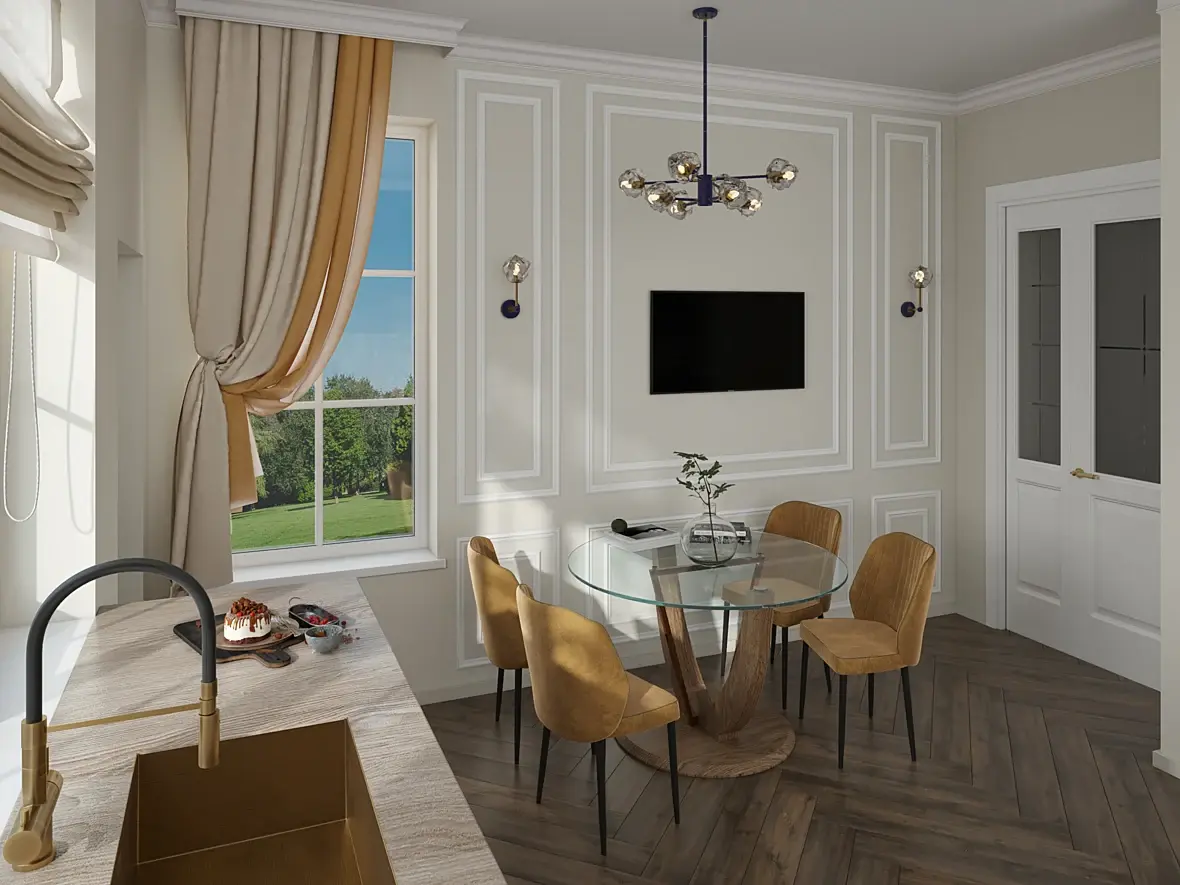 С дизайном сначала разберитесь, тяжело на это без слез смотреть. Зачем эта дверь входная у окна? К чему там телевизор, кто и как его будет смотреть? Цоколь у кухни маленький, витрины какие-то странные(внутри лучше стеклянные полки сделать, плюс свет включить), мойка непонятная, как такую установить вообще? Что по конструкции между подоконником и столешницей? Окно лучше сделать выше или уж единую столешку чтоли. Вытяжки нет, варочная по оси от нее смещена, духовка какой-то монстр. Стол придвинут к стене как в малогабаритках, хотя тут вроде претензия на дорого-богато. Фартук в полторы плитки выглядит так себе, люстра и светильники вообще страшные. По визу претензии только к фону за окном, в остальном для новичка вполне сносно, можно еще с освещением помудрить конечно, чтобы было объемнее.. Картинка никогда не будет выглядеть реалистичной, если не учитывать разного рода конструктивные моменты.
