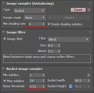 Попробуйте с этими двумя значениями поэкспериментировать. Найдите баланс качество-время,поставьте на Noise treshold 0.005 и играетесь с Min Shade rate.