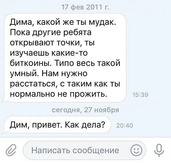 в 2009, норвежский студент Кристофер Кох потратил на криптовалюту около 27 долларов. Купил немного чисто поржать — как раз тогда Кристофер писал научную работу по криптографии. Биткоины куплены, работа сдана — время отдыхать и двигаться дальше. Про свои вложения Кристофер мигом подзабыл.Переместимся в апрель 2013 года, когда курс биткоинов начал взлетать. Тогда вся мировая пресса начала писать про эту электронную валюту, и Кох вдруг вспомнил о своих сбережениях. Открыв свой счёт, Кристофер обнаружил 5000 биткоинов на сумму около 885 тысяч долларов.Обналичив 20% от этой суммы, Кох смог купить квартиру в одном из богатых районов Осло.Его спутница жизни всегда скептично относилась к обмену настоящих денег на виртуальные. Теперь ей пришлось переменить своё мнение (по пути из одной из ванных комнат в одну из столовых, очевидно). «Раньше она жаловалась на то, что я постоянно покупаю кучу технических приспособлений, которыми никогда не пользуюсь, а теперь ещё и фальшивые деньги какие-то», — говорит Кох. «Теперь она говорит, что мне можно разрешить покупать всё, что мне вздумается».