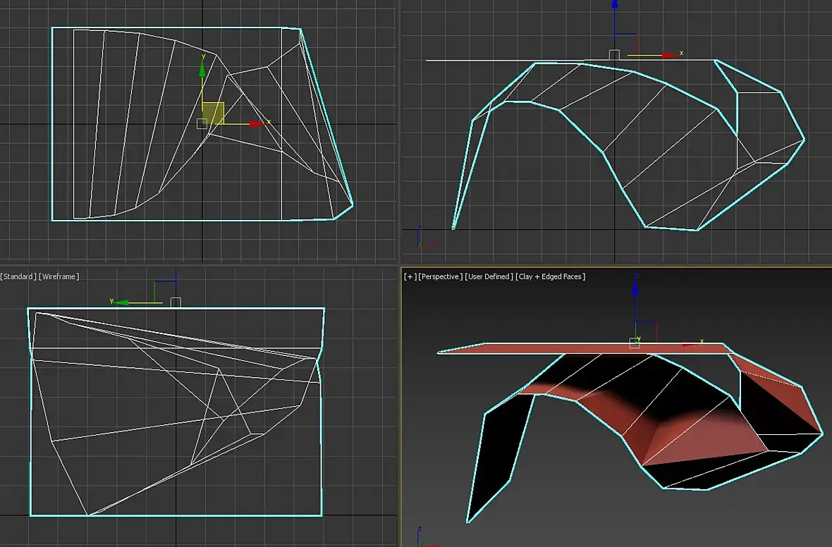 Сначала сплайн 400х20 мм сечением, с подравниванием кривизны как по дизу. Если гнется плохо , то двумя сплайнами и более. Затем создать бокс -эдит поли-экструд по полигону вдоль аккуратного созданного сплайна. Итого мин 20-25