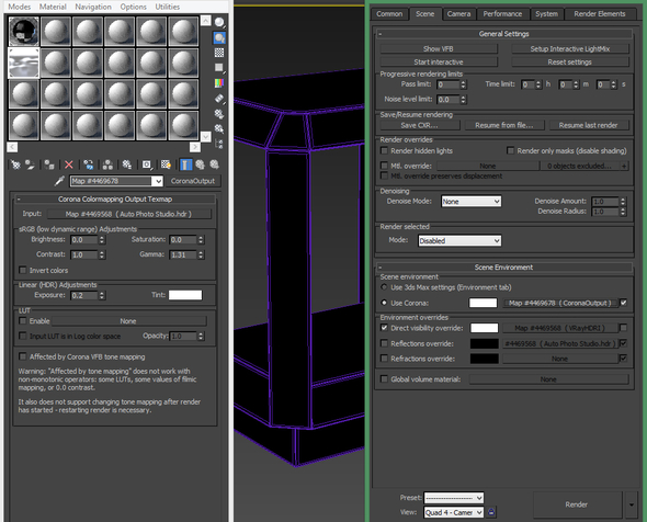 Никаких источников света и чего-либо еще в сцене нет, только сам столик. Карту закинул в Corona Scene Environment (CoronaOutput>CoronaBitmap>файлHDRI), немного подкрутил кривые в output, экспозицию и гамму.