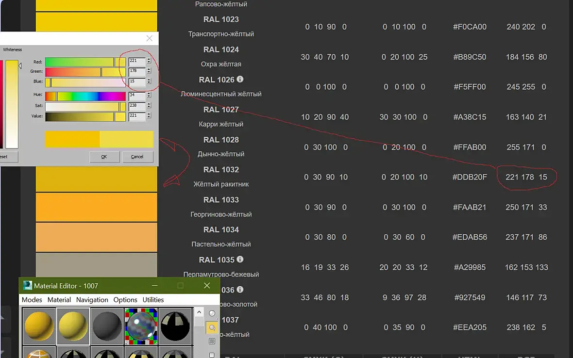 Столкнулся с несовпадением цветов по каталогу RAL при наборе кода. Монитор отражает достаточно правдивый оттенок проверял по бумажному каталогу цветов. А вот сам макс почему то оттенки искажает. Пример на фото.