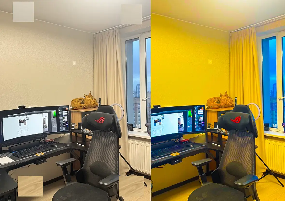 тот же цветовой баланс и разница яркостей. фото моего угла: