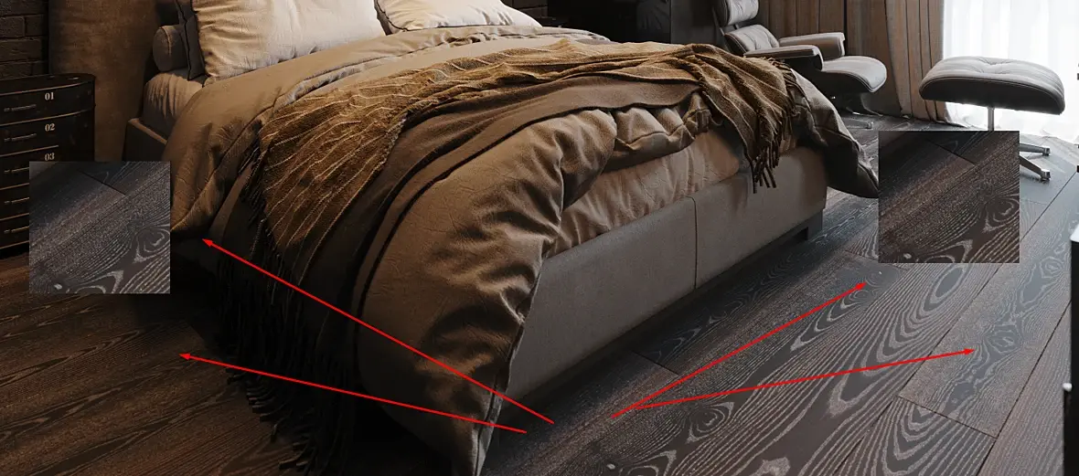 осветите одну комнату теплым светом другую холодным , и в жизни ламинат будет разным . я как бы не новичек тоже) . Картинка эта ни о чем не говорит . С одной стороны дома солнце , с другой тень . Цвет у материалов разный будет . А надо привести к эталону(для заказчика , чтобы не было вопросов) , это я про свой опыт говорю, и ни кому почему то клозапы ни какие не нужны ни когда были . Хотя в уроках их очень много