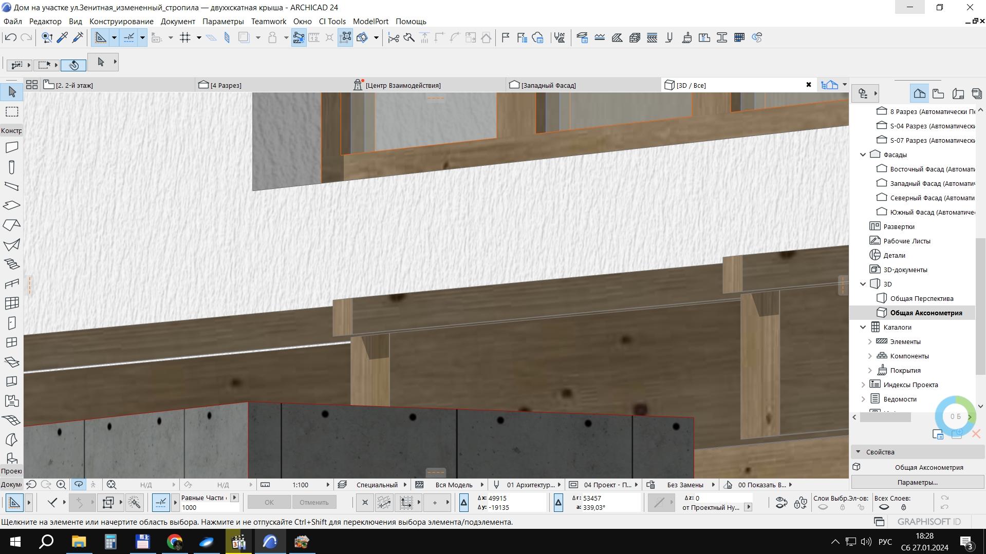 Здравствуйте, Архитекторы! Вот возникла такая проблема. Прошу помочь разобраться с этим. Делаю я крышу для дома. У меня их получается две, одна двухскатная, еще одна плоская односкатная для веранды. На скринах все показал. Для односкатной уже сделал стропила, на них уложил контробрешётку, я так понимаю, она укладывается на стропила сверху, на неё потом укладываем обрешетку. Стропила понятное дело создавал под крышу инструментом Roofmaker, автоматически. Там еще многое приходилось менять, просто чтобы сами детали переименовать более понятно, например, "контробрешётка 50х50", обрешетка "1200х100" и т.д. Одними словом немного поменял все под себя. Угол ската крыши я сделал 7 градусов. Так вот. Когда я укладывал контробрешётки, у меня выявились зазоры между рейками контробрешётки и стропилом. Мне приходилось подгонять контробрешётку под стропило, чтобы избавиться от щели, но дело в том, что на нижнем краю стропилы рейка контробрешетки касается самой балки стропилы, вроде все нормально, на другом конце стропилы эта рейка как бы висит в воздухе. Если немного подогнать эти рейки контры еще, они вроде лежат на стропиле, но в 3д виде видна щель, зазор такой. Я хочу спросить у Вас, есть ли инструмент архикада, которым можно автоматически подогнать рейку контры под балку стропилы, чтобы программа сама убрала этот зазор? В Автокаде есть точно такая же функция. Помогите, пожалуйста. Всем заранее БлагоДарю.