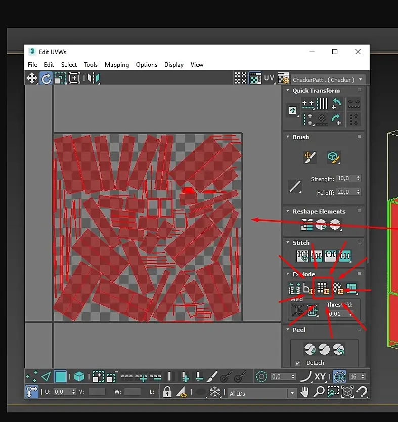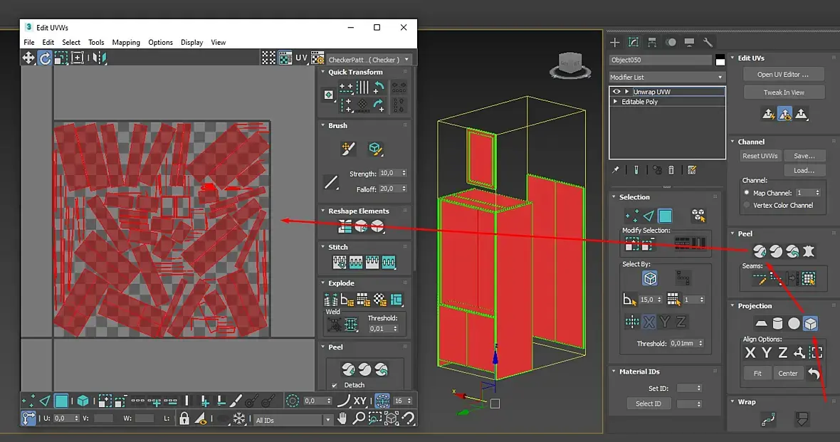 Peel режет модель по швам. Чтобы развернуть такую модель, достаточно сделать Mapping - flatten mapping.